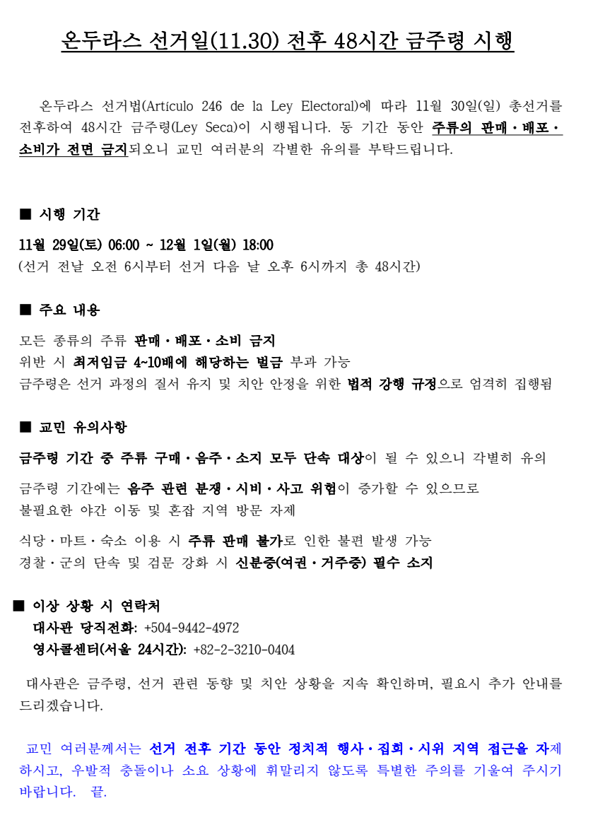 온두라스 선거일(11.30) 전후 48시간 금주령