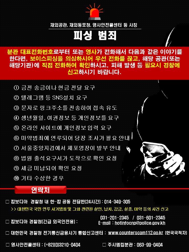 최근 재외공관, 외교부, 재외동포청, 영사안전콜센터 등을 사칭한 보이스피싱 범죄가 급증하고 있습니다. 아래 안내문을 참고하시어 피해가 발생하지 않도록 주의해 주시기 바랍니다.