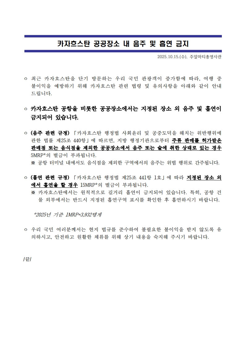 [안전 공지] 카자흐스탄 공공장소 내 음주 및 흡연 금지