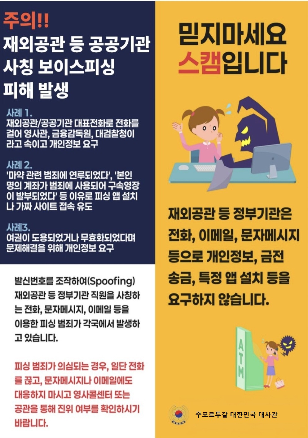 o 최근 유럽을 포함한 다수 국가에서 재외동포를 상대로 대사관, 검찰청, 금융감독원 등 수사기관이나 공공기관을 사칭하며 개인정보나 금품을 요구하는 사기 피해 사례가 접수되고 있습니다.
