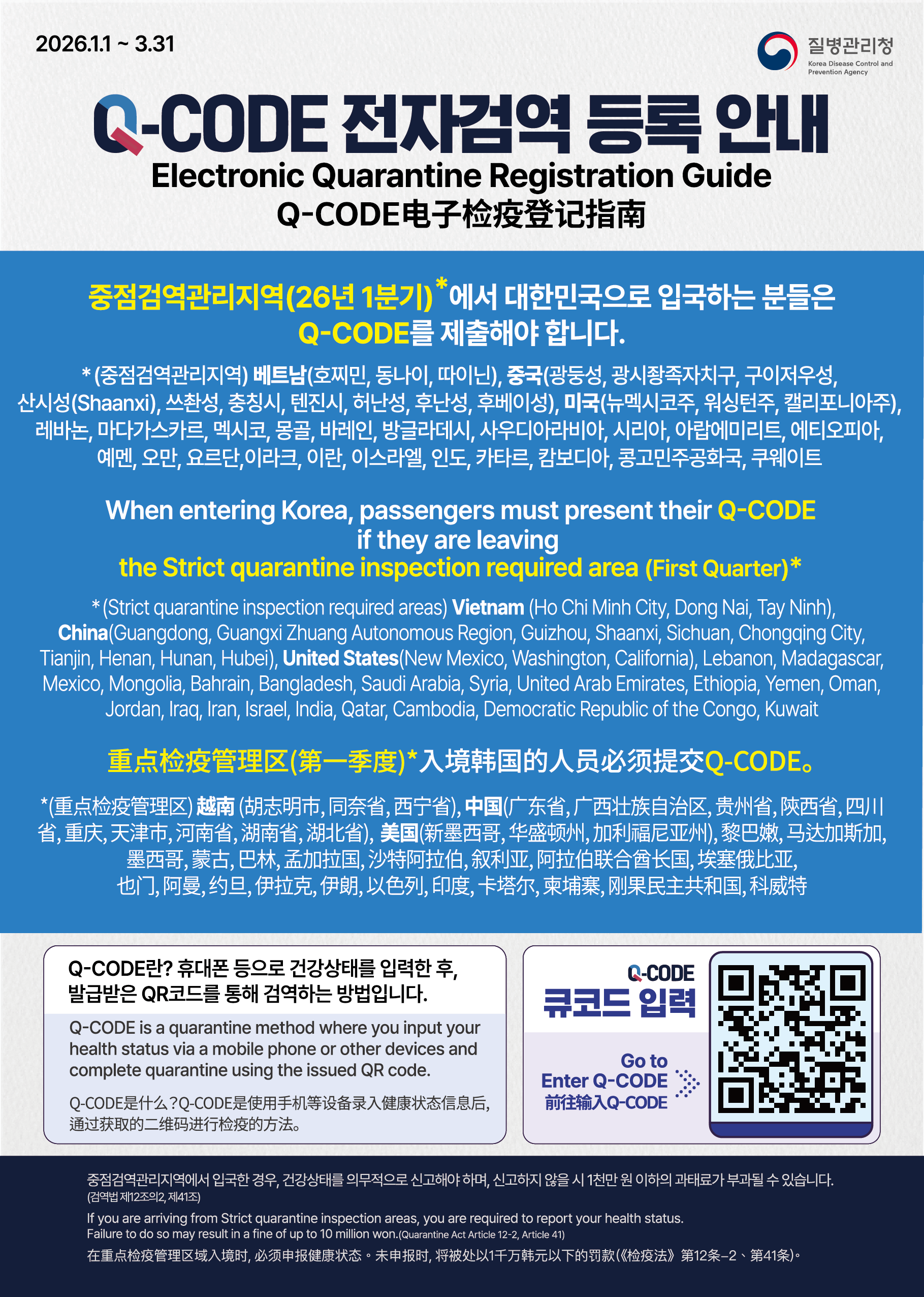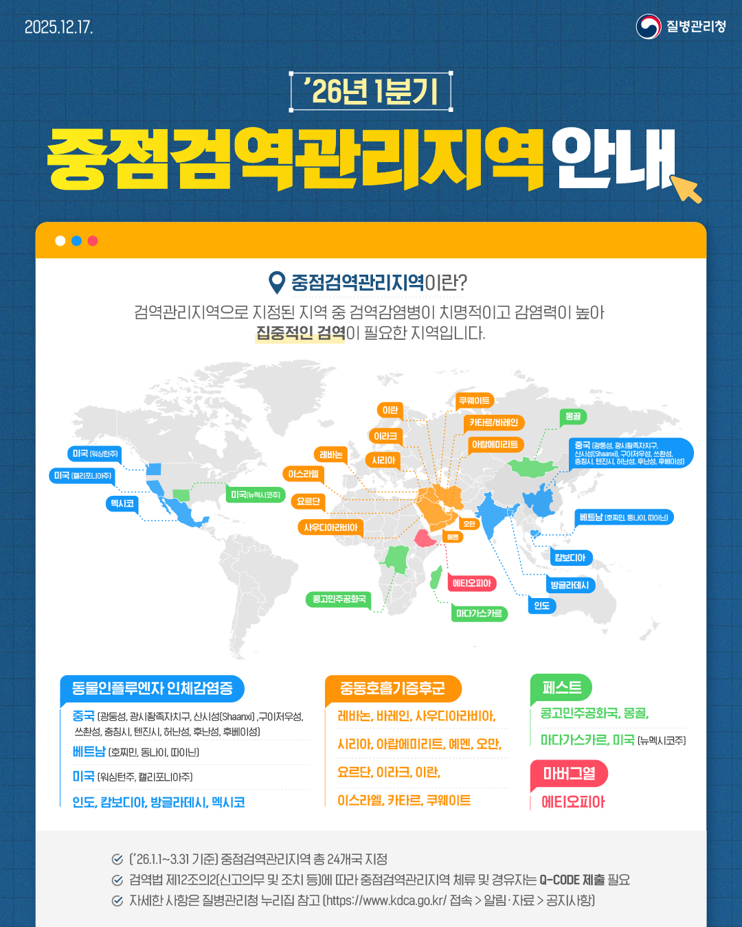 질병관리청에서는 입국자 안내와 검역 조사가 원활히 진행될 수 있도록 2026년 1분기 중점검역관리지역과 검역관리지역을 다음과 같이 안내 및 2026년 1월 1일부터 시행한바 교민 여러분들께도 알려드리오니 확인 후 한국 입국에 차질이 없으시길 바라며, 아울러 주변에도 널리 알려주시길 바랍니다.