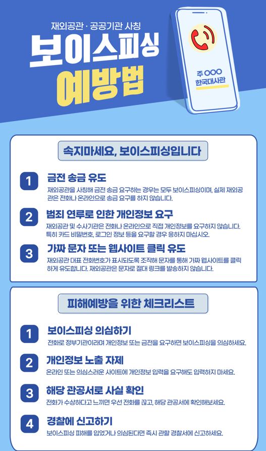 당부 드리며 아래 보이스피싱 주요 사례 및 예방수칙 포스터를 참고하시어 피해 예방에 활용하시기 바랍니다.