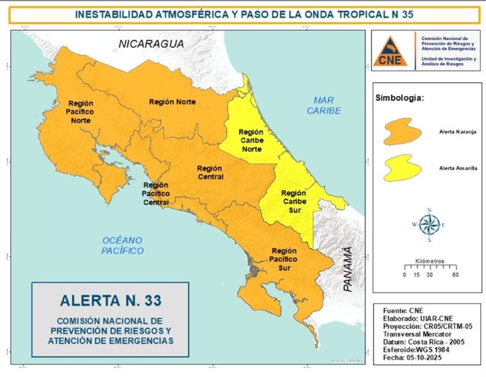 2025년 10월 6일 현재 기준 코스타리카 국가비상대책위원회(CNE)가 공고한