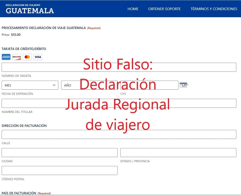 o 보고된 사례들에 따르면, 정상적인 입국신고서와 유사한 양식을 작성하고 나면 달러 결제(USD 15~24)를 요구하지만, 과테말라 정부에서 운영하는 공식 입국신고 사이트에서는 절대 결제를 요구하지 않습니다.