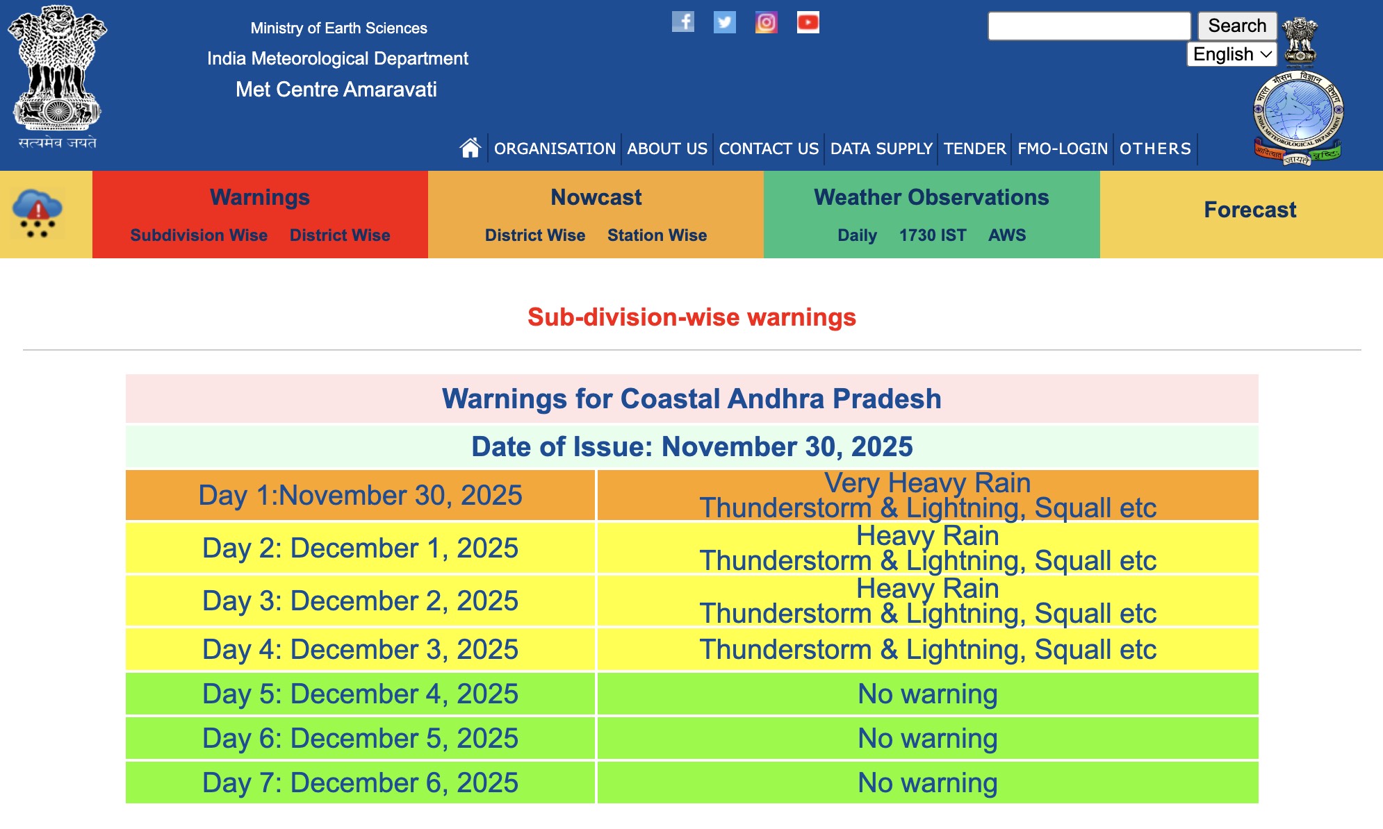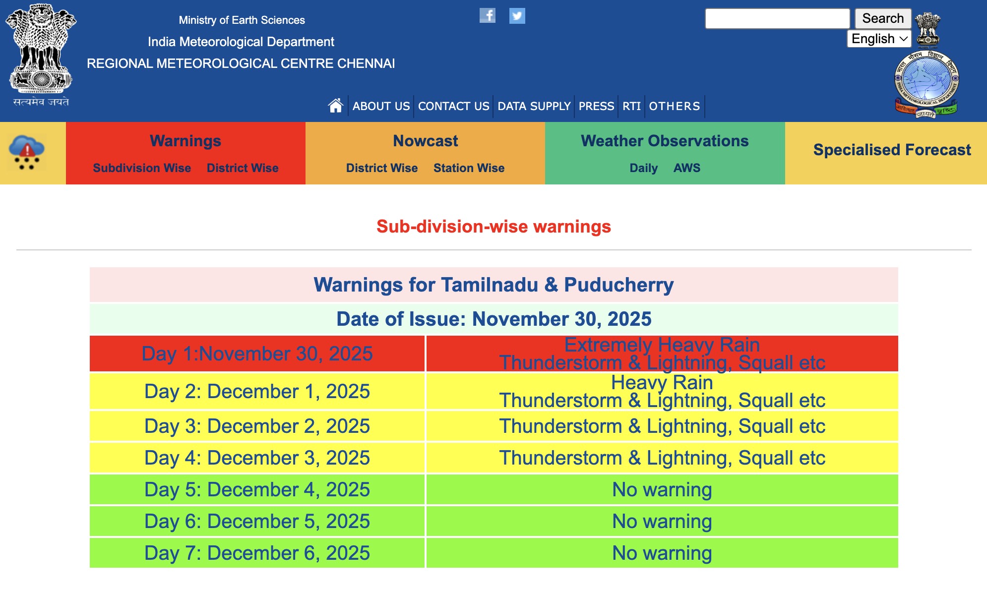 인도 기상청(India Meteorological Department)은 타밀나두주, 푸두체리 연방직할지, 남부 안드라프라데시주 지역에 사이클론 경보를 내렸습니다. 동 사이클론 폭풍의 영향으로 인해 해당 지역에 폭우, 강풍, 해일, 높은 파도 등이 발생할 우려가 있어 각별한 주의가 요구되고 있습니다. 해당 지역에 거주하거나 여행 중인 우리 국민께서는 불가피한 경우를 제외하고 외부 출입을 자제하는 등, 현지 방송의 기상 특보 프로그램 등을 수시로 확인하여 안전에 각별히 유의해 주시기 바랍니다.