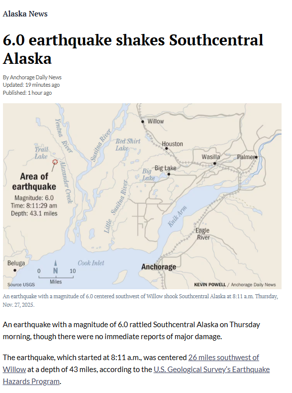 오늘(11/27) 알래스카 현지시간 오전 8시 11분경, 알래스카 남중부 Willow 남서쪽 26마일, 깊이 43마일 인근 지역에서 진도(규모) 약 6.0의 지진이 발생했습니다.