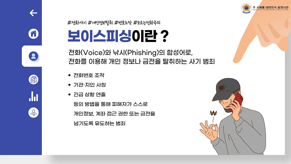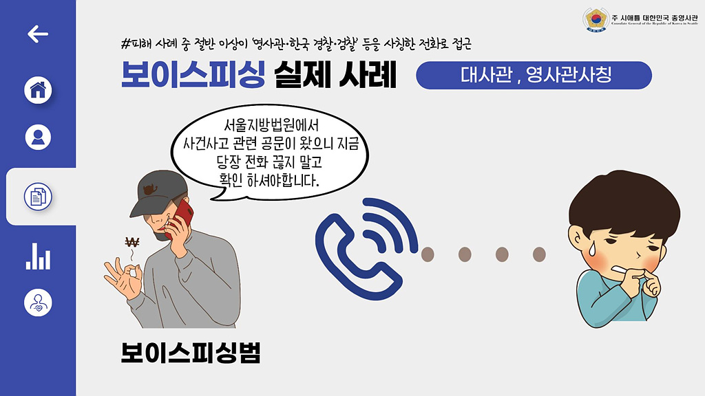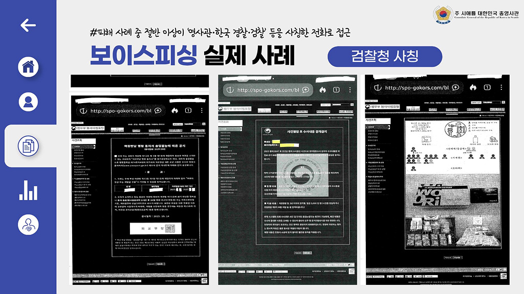 (예 : 대사관 또는 영사관 직원을 사칭하여 한국 대검찰청, 금융감독원, 경찰청 또는 법무부로부터 전화 수신인에게 전달할 사항이 있는 것처럼 속이는 행위, 전화 수신인에게 범죄기록을 확인할 수 있다며 가짜 사이트에 접속하도록 유도하여 개인 정보를 확보하고 송금을 유도하는 행위 등 현재까지 다양한 방식으로 범죄 수법 진화 중)