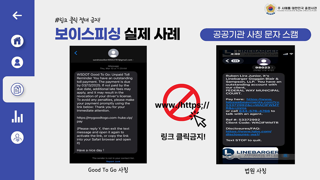 주시애틀총영사관을 포함 모든 재외공관 및 대한민국 경찰, 검찰, 법무부 등은 텔레그램, 시그널등 메신저를 사용하지 않으며, 절대 개인정보, 금융정보를 요구하지 않습니다