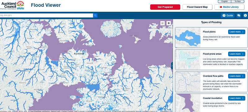 오클랜드 시청은 2023년 홍수 이후, 기존 홍수 및 산사태 위험 지도를 기반으로 무료 온라인 Flood Viewer를 제공하여 시민들이 직접 주소별 홍수 위험, 저지대 침수 가능 지역, 물의 자연 흐름 경로, 해안 침수 예상 지역 등을 확인하고, 침수 예상 지역을 사전에 파악하여 대비 계획을 수립 할 수 있도록 하였습니다.
