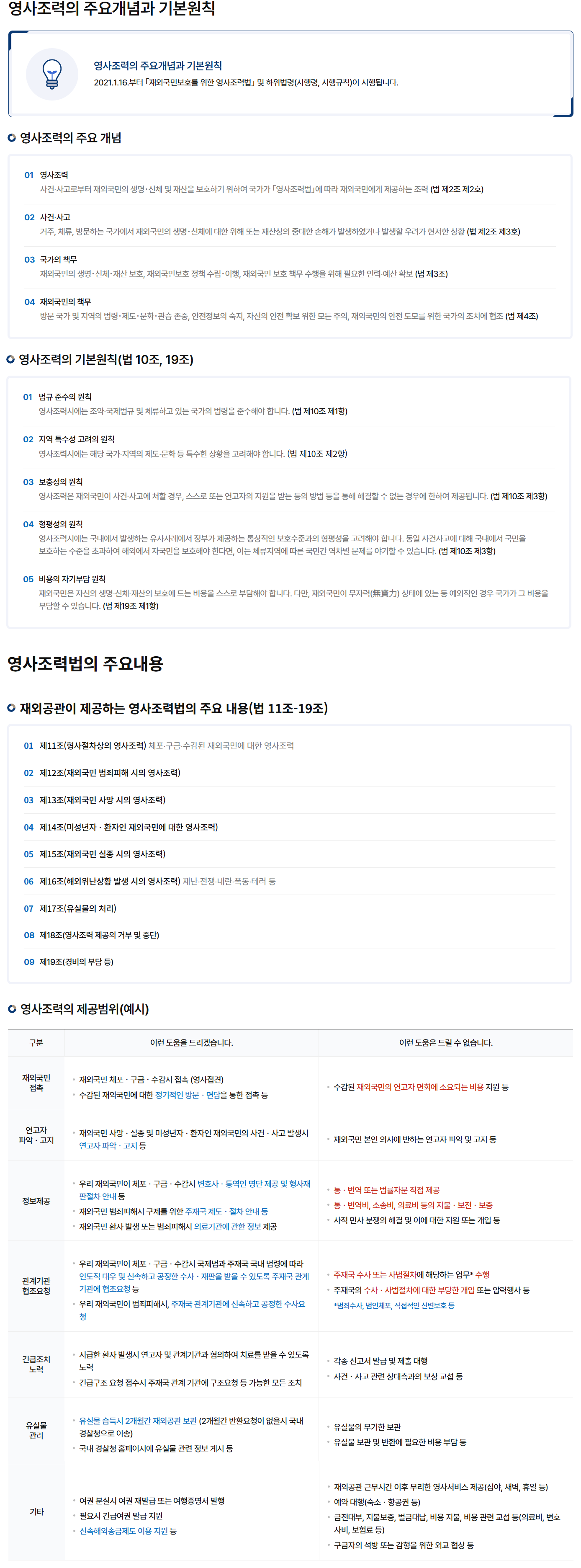 오클랜드분관은 재외국민 보호와 관련하여 국제법, 주재국 법령, 대한민국 법령을 근거로 영사조력을 제공합니다. 다만, 주재국 주권에 속하는 법 집행 사항(예: 출입국 거부, 범죄인 체포 등)의 경우, 공관이 직접 개입할 수는 없으며, 개인정보 보호 등 관련 법령의 범위 내에서 안내와 필요한 지원을 제공합니다.