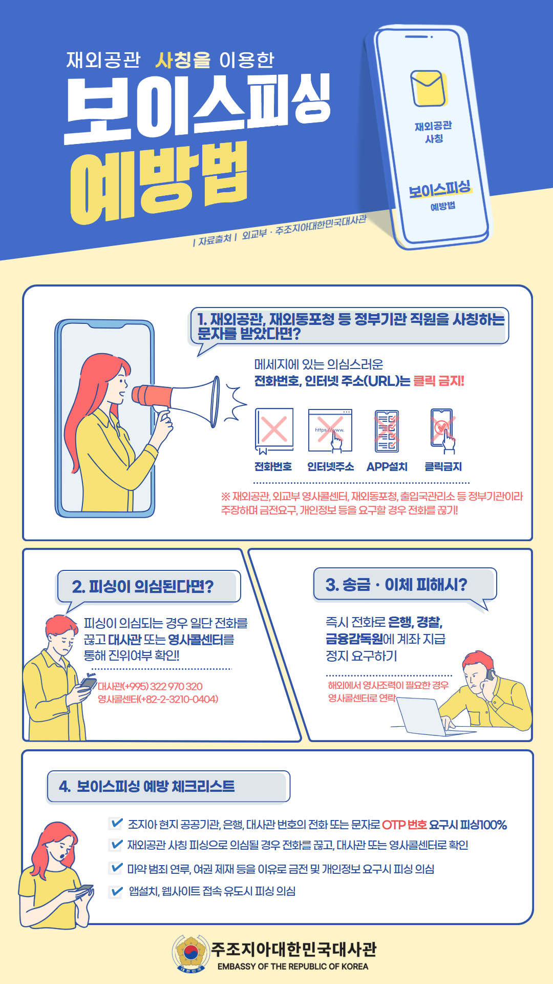 최근 대사관을 사칭하여 개인정보 제공, 금전을 요구하는 전화 사례가 다수 발생하고 있습니다. 조지아에 체류 하시는 우리 국민 여러분께서는 각별히 주의해주시기 바랍니다.