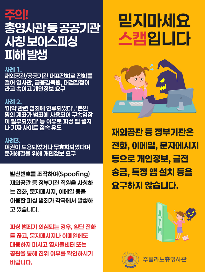 ㅇ 최근 유럽을 포함한 다수의 국가에서 재외동포를 상대로 정부기관을 사칭하며 개인정보나 금품을 요구하는 사기 피해 사례가 접수되고 있습니다.