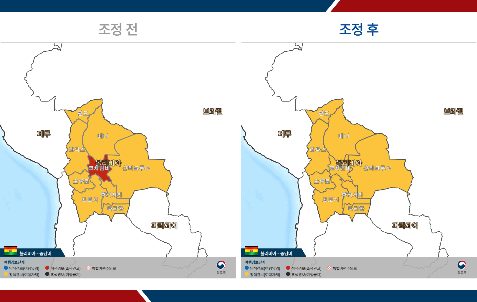 볼리비아 코차밤바주 치안이 안정화됨에 따라, 외교부는 2025.12.19.(금) 13:00부로 여행경보를 현 3단계(여행 취소,연기/긴요한 용무가 아닌 한 철수 권고)에서 2단계(여행자제)로 하향 조정하였습니다.