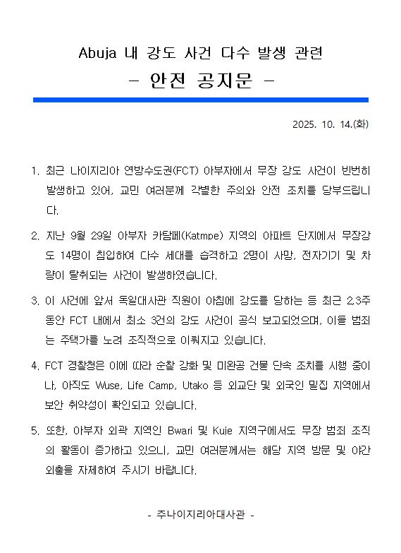 (안전공지) 아부자 내 강도 사건 관련 안전 유의 당부