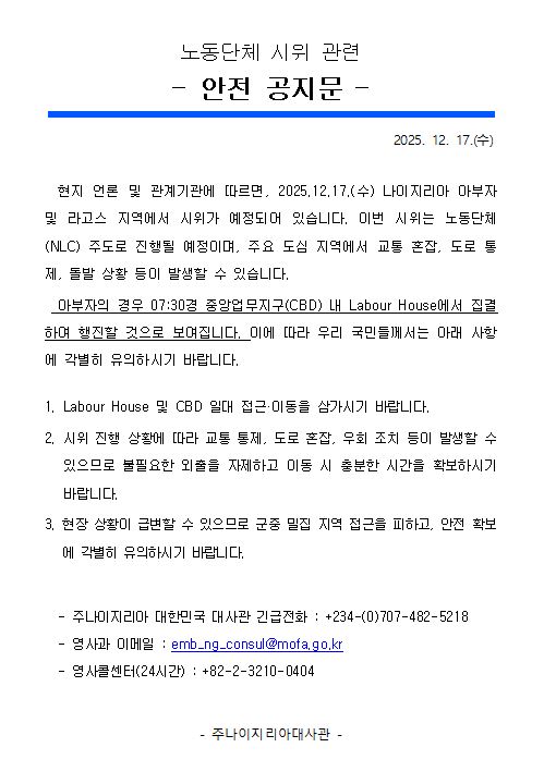 (안전공지) 251217 나이지리아 노동단체 시위예정 관련