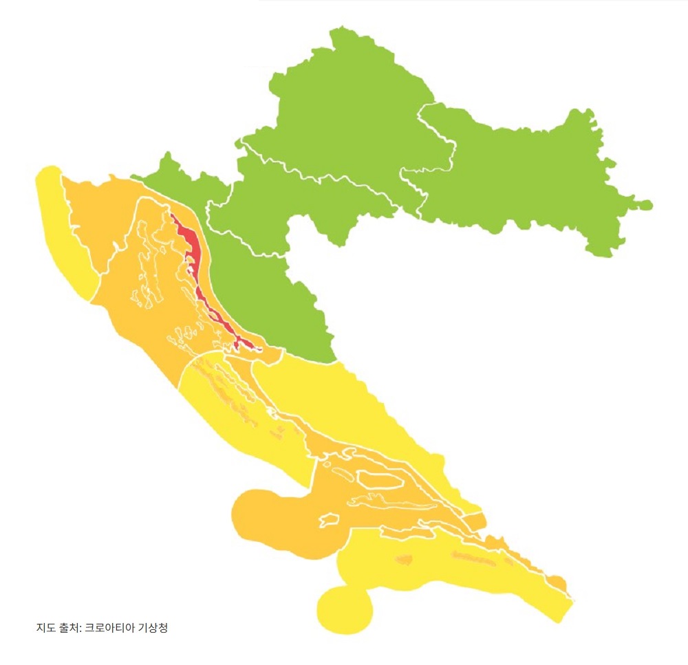 o 크로아티아 기상청은 10.2(목) 벨레비트 해협에 최대 시속 65-185km를 예고하며 강풍경보 4단계(매우 위험)를 발령하였으며, 아드리아해안 전역에는 3단계(위험), 이외 일부 아드리아해상 및 달마티아 내륙 지역에는 2단계(위험 가능)를 발령하였습니다.