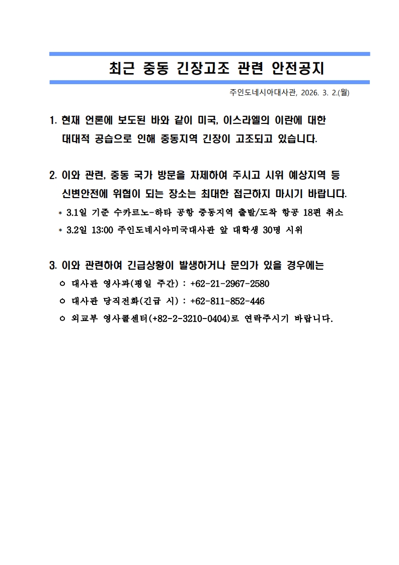 [대사관 안전 공지] 최근 중동 긴장고조 관련 안전공지