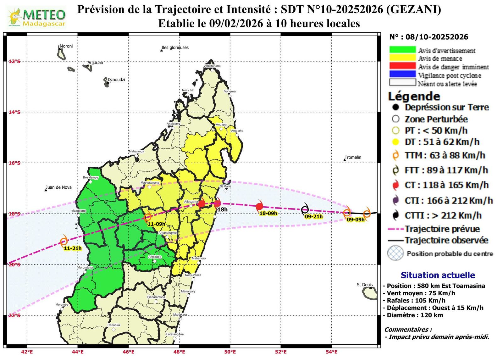 열대폭풍 GEZANI가 2.10.(화) 오후 마다가스카르 북동부 Mananara Nord 와 Vatomandry 사이 해안으로 상륙할 것으로 예상됩니다. 이에 당국은 아래와 같이 경보를 발령하였습니다.