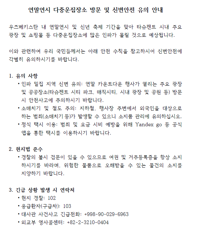 연말연시 다중운집장소 방문 및 신변안전 유의 안내