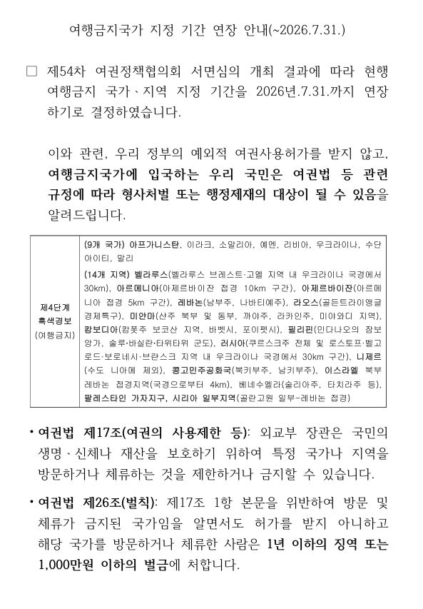 여행금지국가 지정 기간 연장 안내(~2026.7.31.)