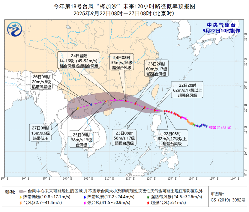 ㅇ 9.21.(일) 최고 등급(17급, 62m/s)으로 강화된 제18호 태풍 ‘라가사(桦加沙)’는 9.23.(화) 새벽 남중국해 북부 해역에 진입 후, 9.24.(수) 새벽-오후 광둥성 산터우-하이난성 원창 일대 해역으로 상륙하면서 세력이 약화될 예정입니다.