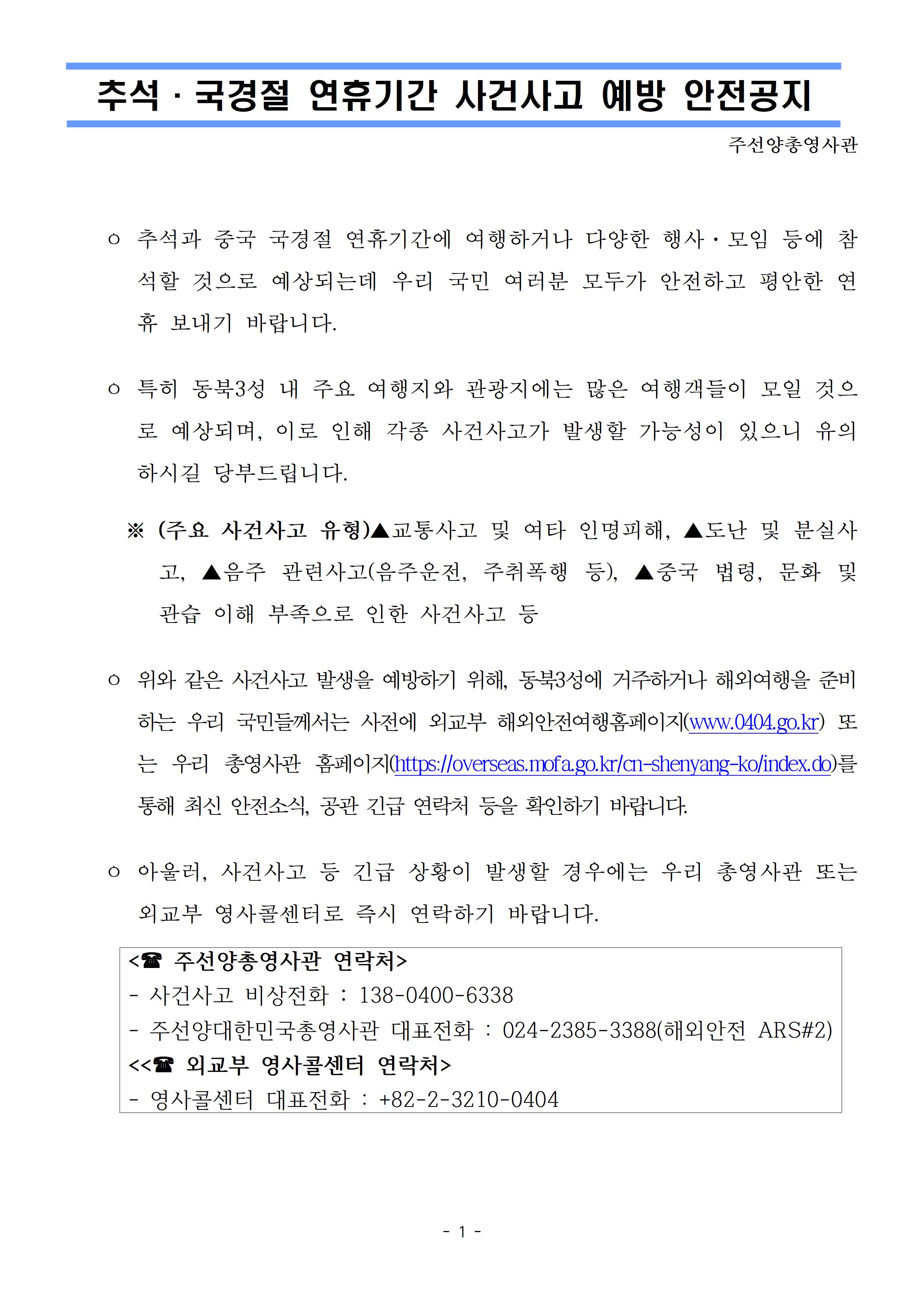 추석 국경절 연휴기간 사건사고 예방 안전공지