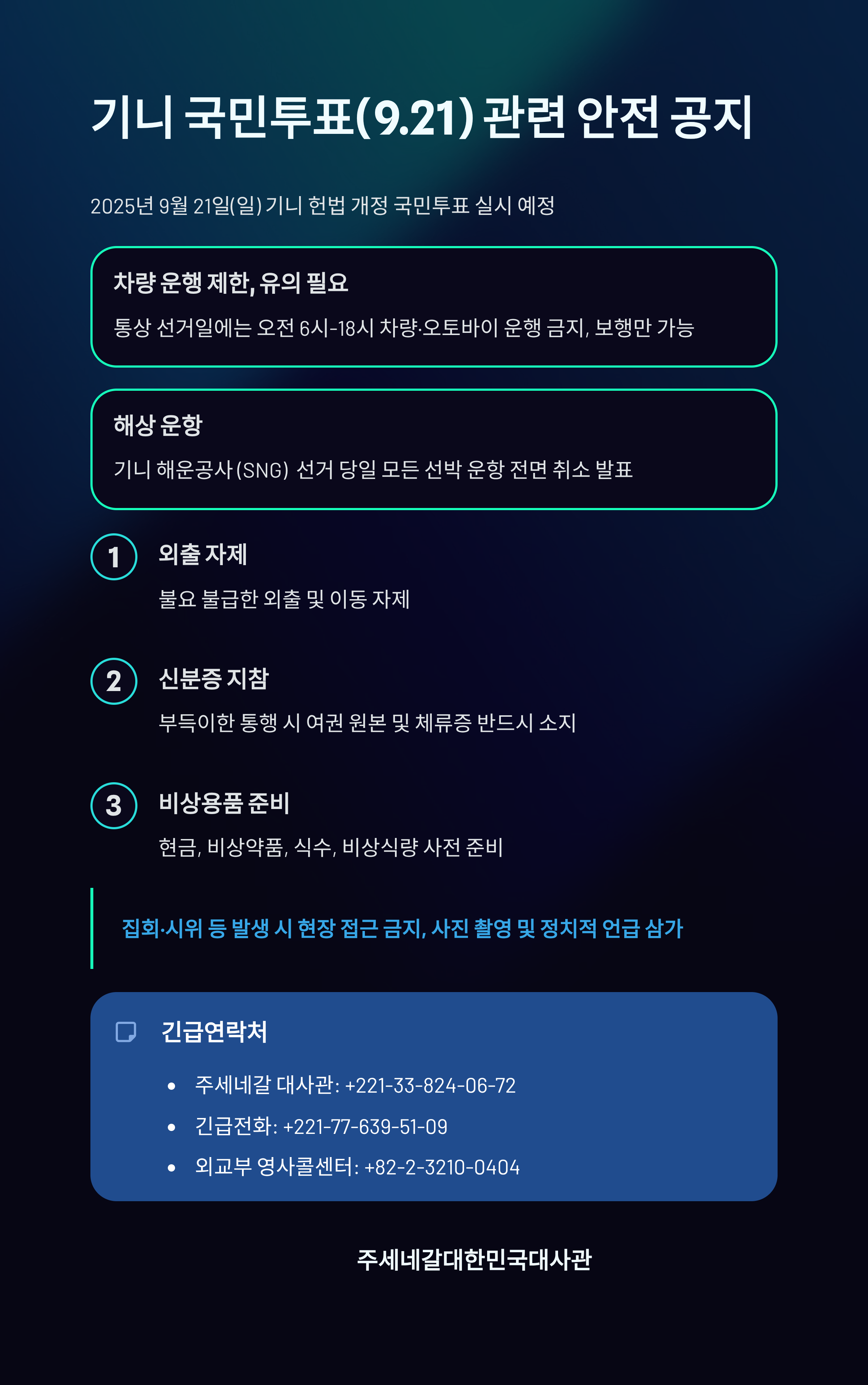 ●해상 운항 관련: 기니 해운공사(SNG)는 9월 17일 발표를 통해 국민투표일(9.21) 예정된 모든 선박 운항을 전면 취소한다고 공지하였습니다(Guinée360, Mosaïque Guinée 등 현지 언론 보도).