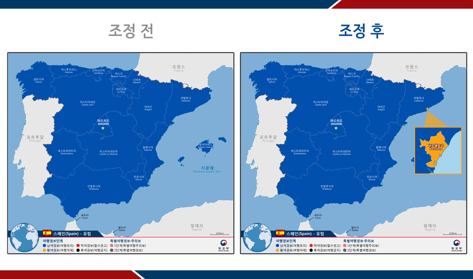 - (바르셀로나) 1단계 남색경보(여행유의) → 2단계 황색경보(여행자제)
