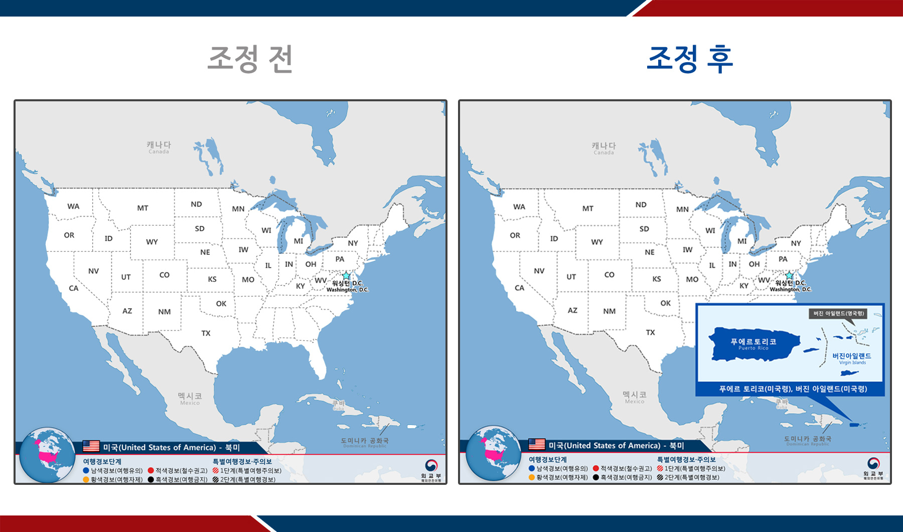 - 조정내역 : 푸에르토리코 및 버진 아일랜드 여행유의(1단계) 신규 발령