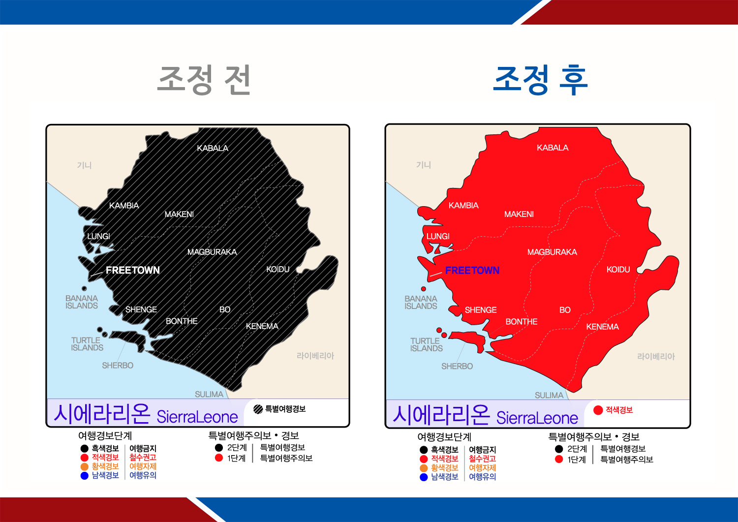 □ 외교부는 12.2(수)부로 시에라리온 전역에 대한 여행경보단계를 기존 특별여행경보(즉시대피)에서 3단계인 적색경보(철수권고)로 조정하기로 결정하였습니다.