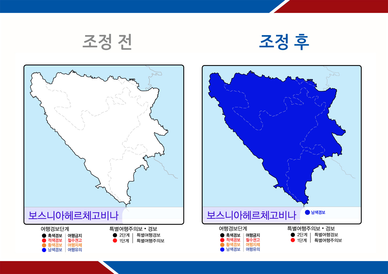 - 조정내역 : 전 지역에 남색경보(여행유의) 발령