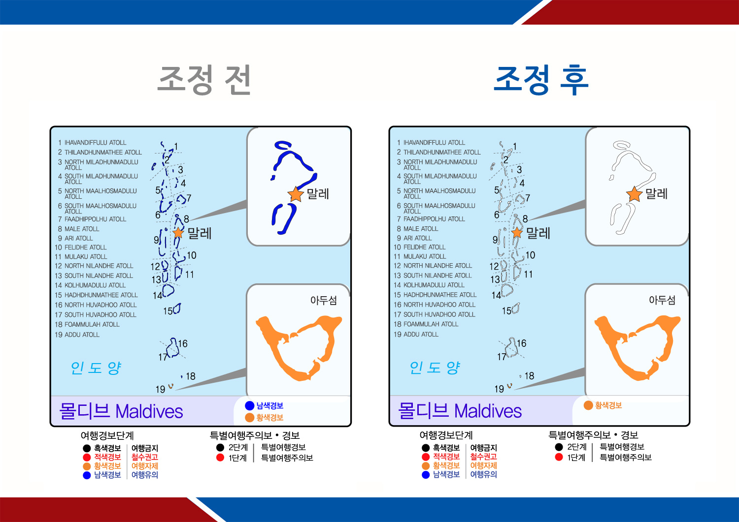 - 조정내역 : 몰디브 말레섬, 아두섬 제외 여타 전 지역에 발령된 남색경보(여행유의)를 해제