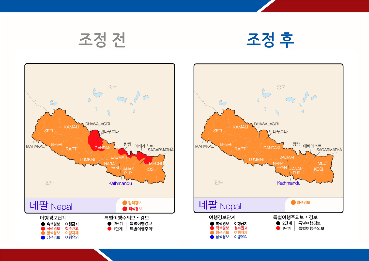 - 조정내역 : 안나푸르나, 랑탕, 에베레스트 산악지역에 발령된 적색경보(철수권고)를 황색경보(여행자제)로 하향