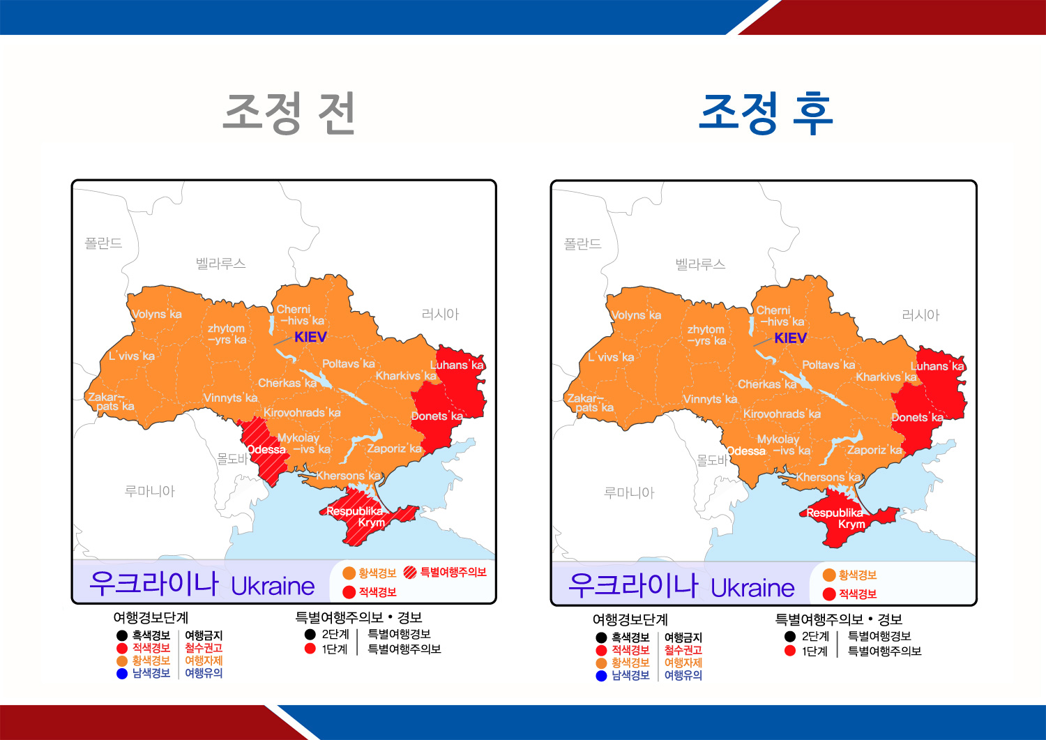 - 조정내역 : △크림지역에 발령된 특별여행주의보를 적색경보(철수권고)로 조정, △오데사지역에 발령된 특별여행주의보 해제 및 기존 발령된 황색경보(여행자제) 유지