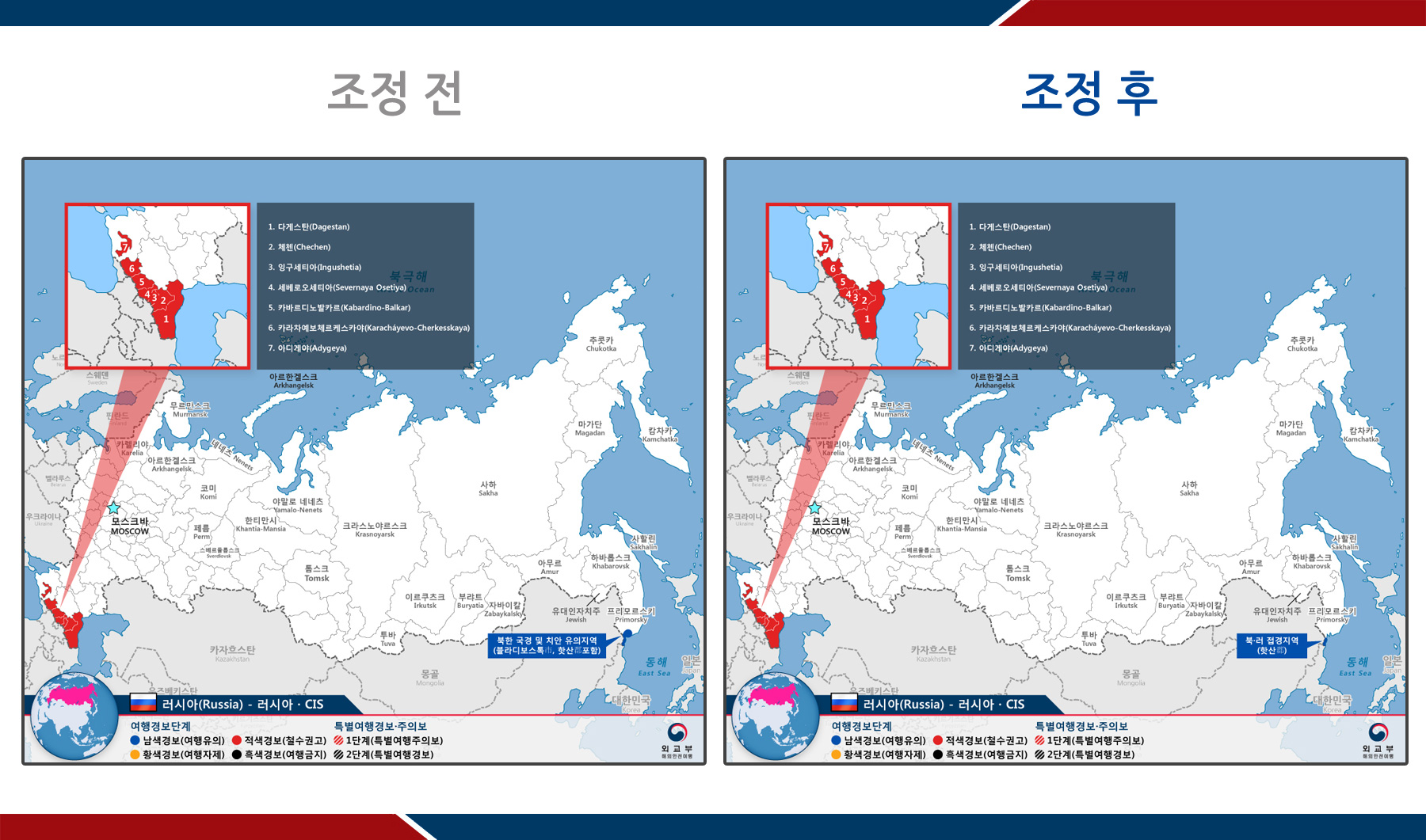 - 블라디보스톡(Vladivostok) 市 : 1단계 남색경보(여행유의) → 해제
