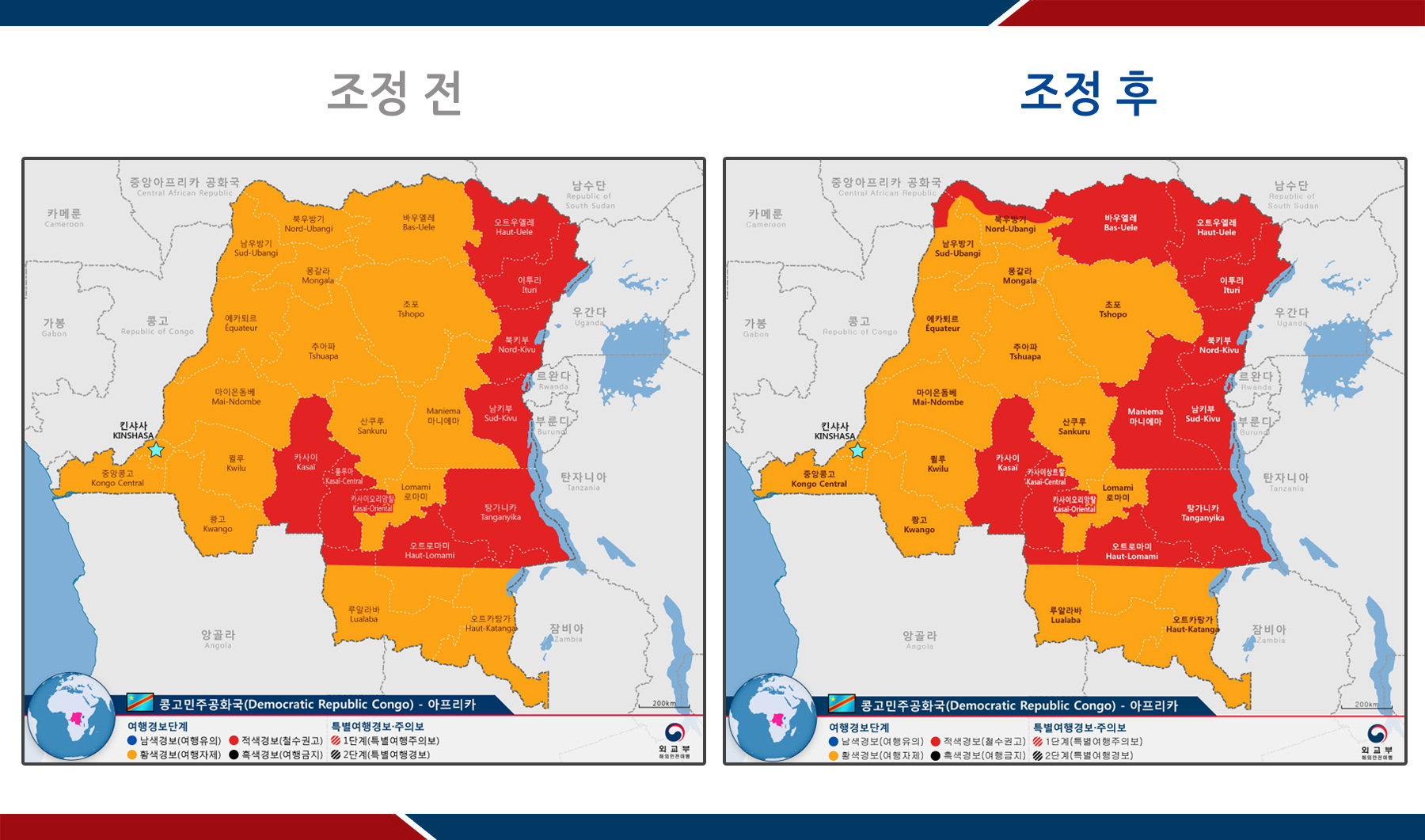 - 마니에마(Maniema), 바스-우엘레(Bas-Uele), 남수단ㆍ중앙아프리카공화국과의 국경 50km 이내 지역 : 2단계 황색경보(여행자제) → 3단계 적색경보(철수권고)