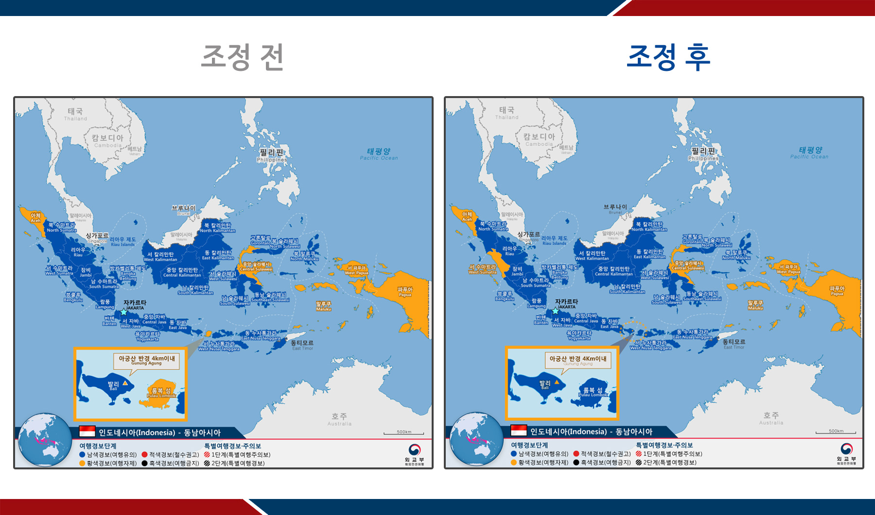 o 인도네시아 서수마트라 주에 대한 여행경보는 기존 1단계(남색경보, 여행유의)에서 2단계(황색경보, 여행자제)로 상향 조정되었고, 롬복 섬에 대한 여행경보는 2단계에서 1단계로 하향 조정되었다.
