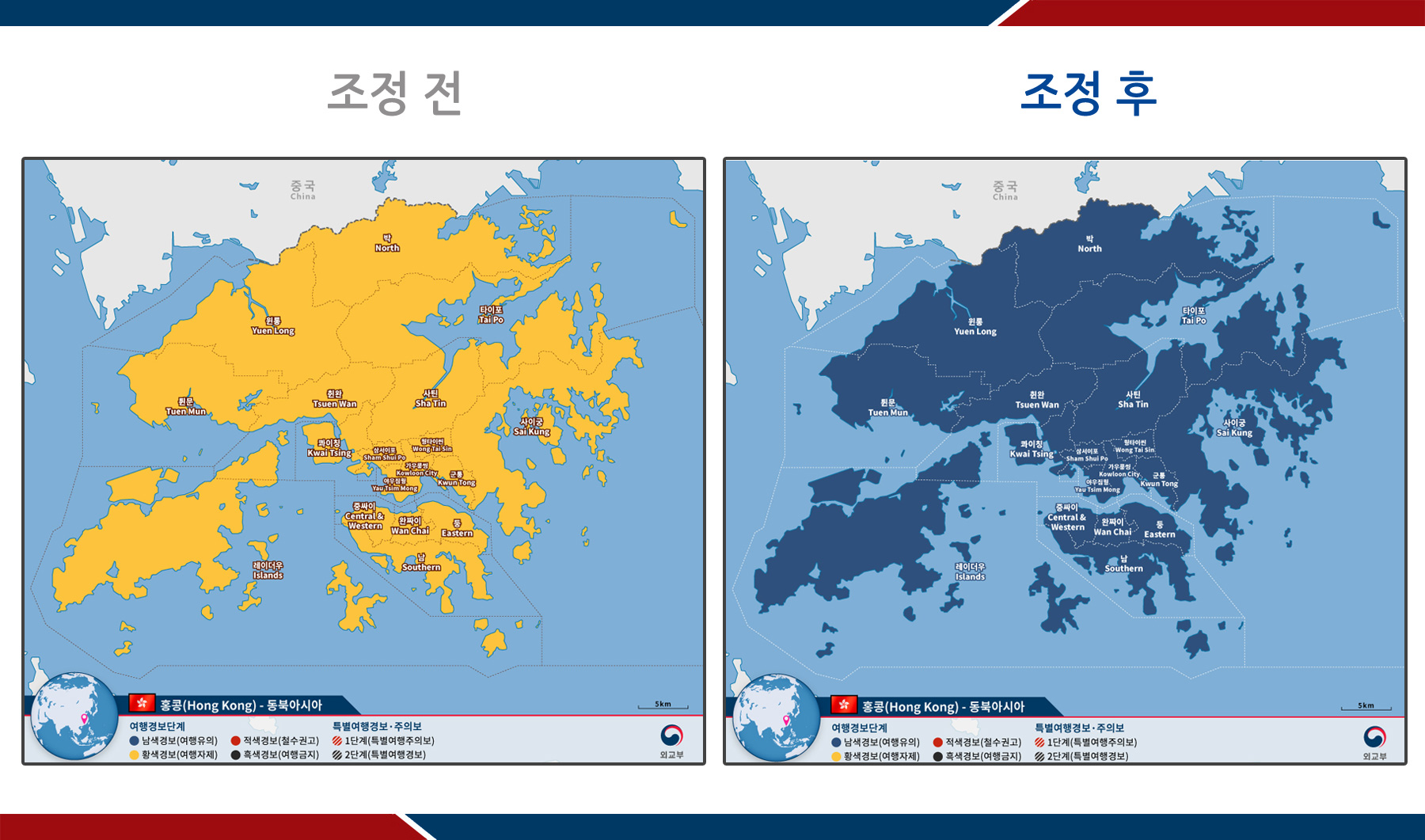 □ 외교부는 최근 홍콩 시위 사태가 안정적 추세를 보이는 상황임을 감안, 2020년 1월 17일부로 홍콩 전 지역에 대한 여행경보를 2단계(여행자제)*에서 1단계(여행유의)로 하향 조정하였습니다.