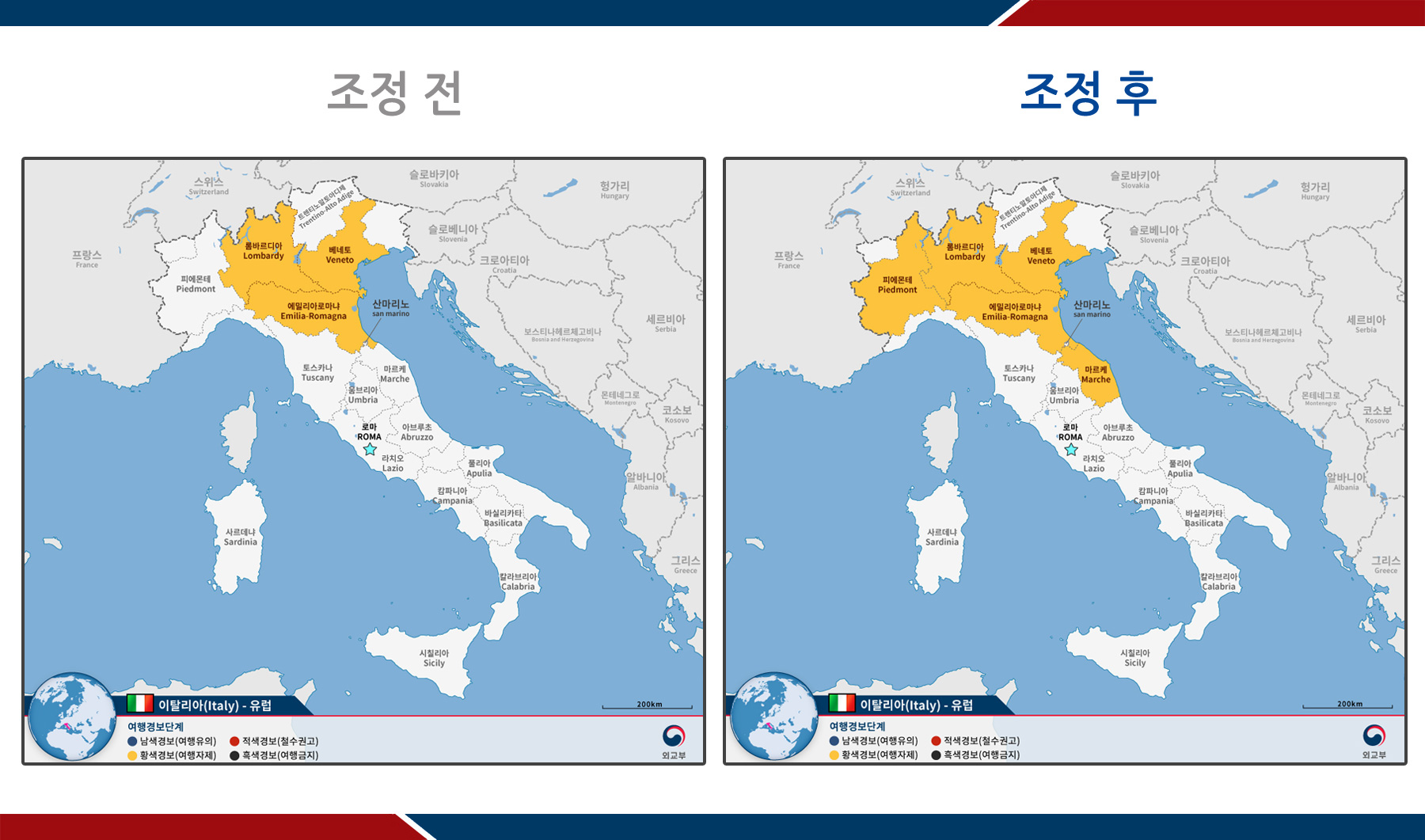 □ 외교부는 3월 9일(월)부로 이탈리아 북부 피에몬테주, 중부 마르케주에 대한 여행경보 2단계(황색경보, 여행자제)를 추가 발령하였습니다. 이로써 이탈리아의 여행경보 2단계 발령 지역은 기존의 북부 3개주(롬바르디아주, 에밀리아-로마냐주, 베네토주)에서 북부‧중부 5개주로 확대되었습니다.