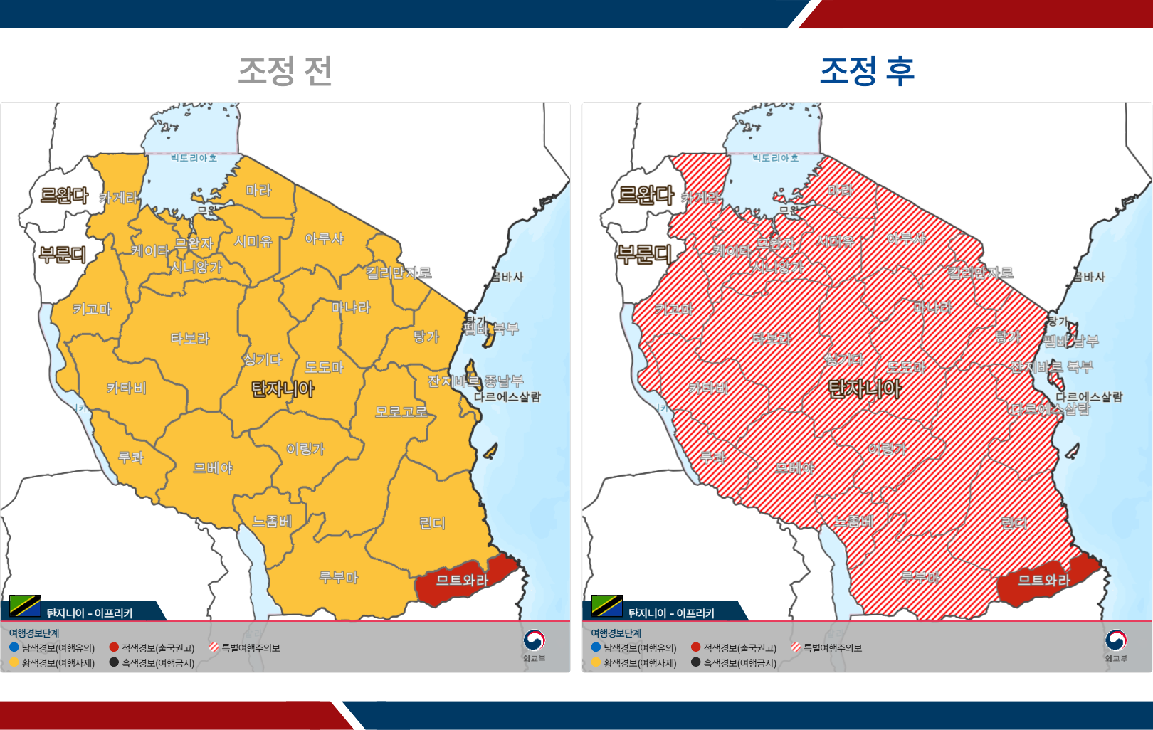 첨부: 여행경보단계 조정 전후 지도(탄자니아)