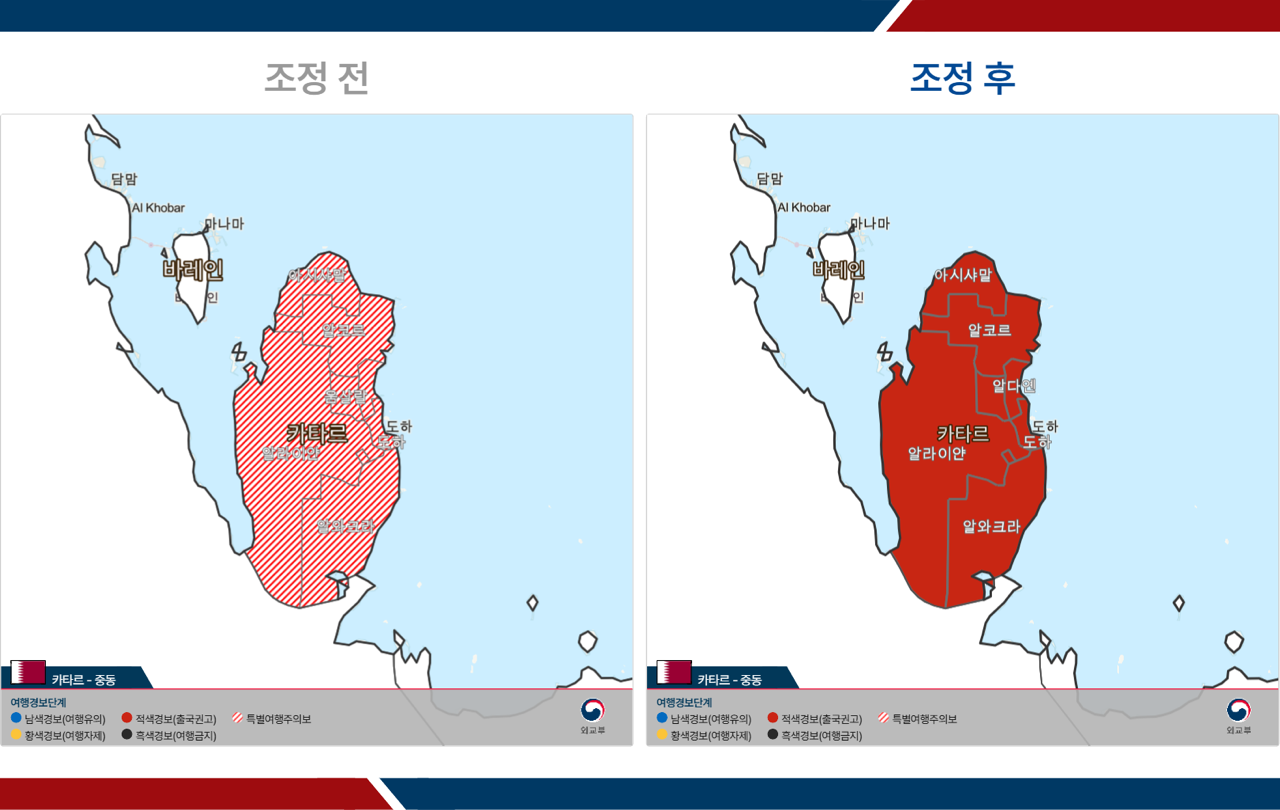 - 카타르: 전역 특별여행주의보 → 전역 3단계(철수권고)