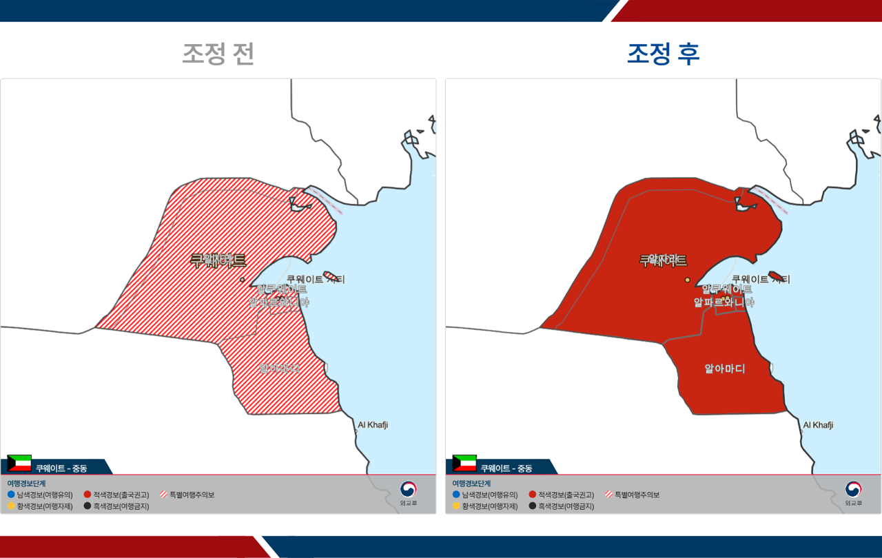 - 쿠웨이트: 전역 특별여행주의보 → 전역 3단계(철수권고)
